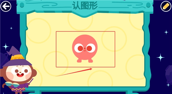 3、系統會清晰標注目標圖形并提供提示箭頭,配合活潑的背景設計幫助孩子集中注意力識別形狀呢。