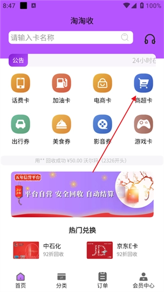 選擇卡券類型進行回收下單,將手中的閑置卡券進行回收變現。