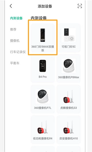 2、挑選需要添加的設備,我在此以“內測設備-360門鈴5MAX雙攝版”作為示例。