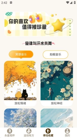 1、音樂資源豐富且分類明確,冥想音樂、助眠音樂等多種類型,為用戶運動和休息營造良好氛圍。
