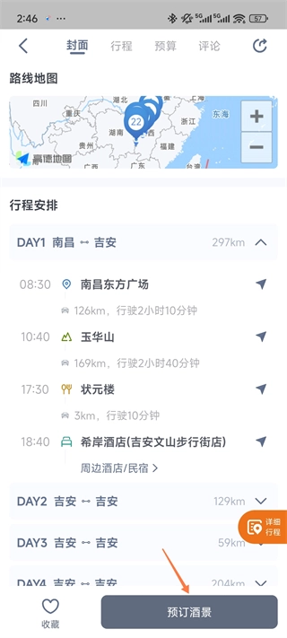 在路線詳情頁,您可以查看每天的行程安排,包括出發時間、駕車時間、用餐時間、觀景時間等。