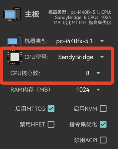5、CPU型號選擇【SandyBridge】,CPU核心數選擇【8】。