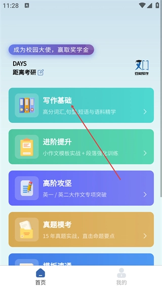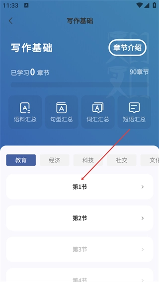 2、在首頁選擇對應學習模塊,如【寫作基礎】,可進入該模塊的學習頁面。