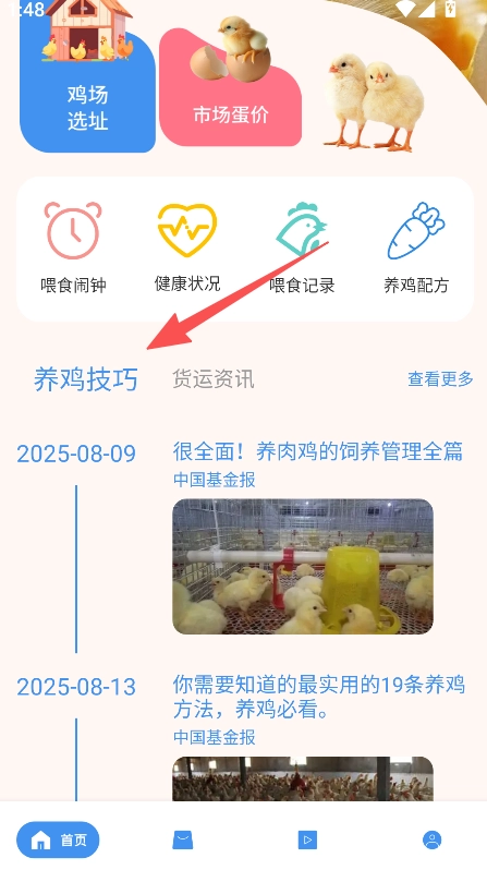 1、打開(kāi)軟件進(jìn)入首頁(yè),選擇養(yǎng)雞技巧板塊。