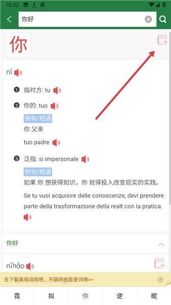 3、進(jìn)入詞條頁面后,點(diǎn)擊右上角的【筆記圖標(biāo)】,即可進(jìn)入生詞本添加流程。