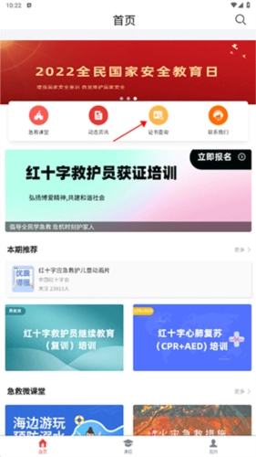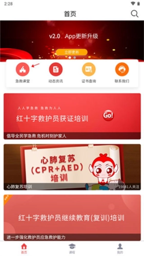 1、如何學習課程,小編拿急救課堂演示,首先打開軟件,在首頁里有急救課堂,點擊進入。