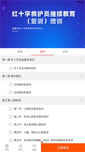 3、我選擇的是付費培訓課程,包含詳情介紹、課程章節和用戶評價。這個課程支持收藏功能,旁邊還有筆記區和問答板塊,能查看其他學員提出的問題。若需購買,點擊“立刻報名”完成付費后即可開始學習。
