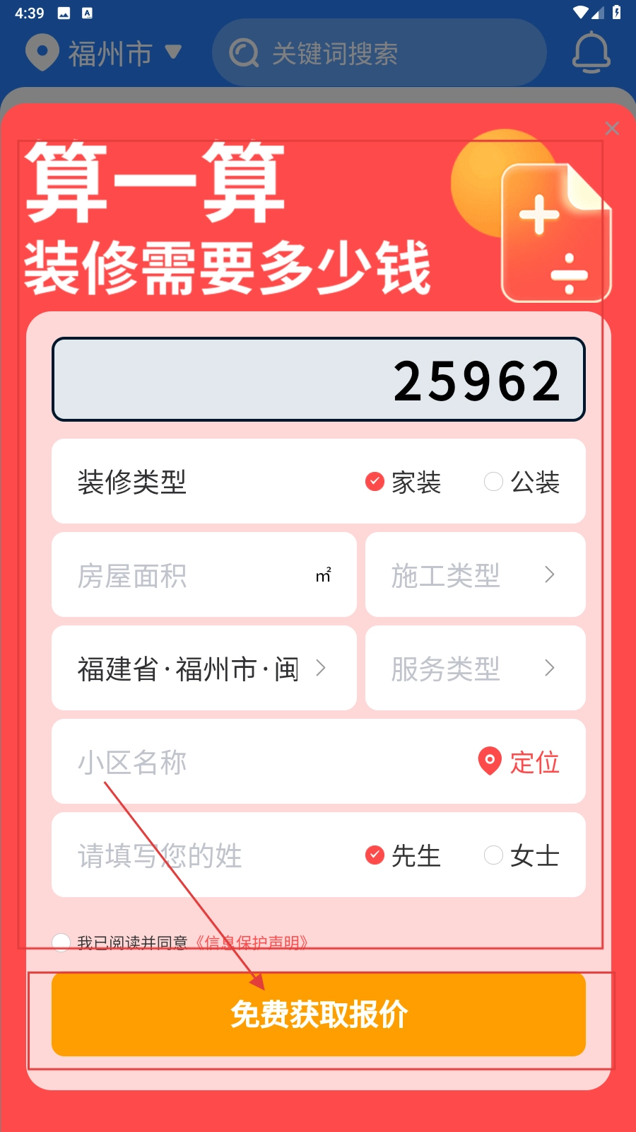 3、勾選協(xié)議,點(diǎn)擊【免費(fèi)獲取報(bào)價(jià)】,提交裝修報(bào)價(jià)需求。