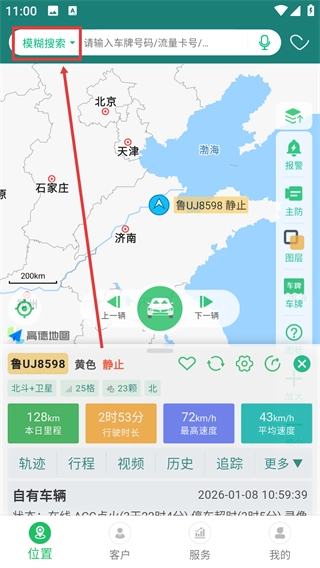 1、在車輛位置頁(yè)面,點(diǎn)擊頂部【模糊搜索】下拉選項(xiàng),可展開(kāi)搜索類型的選擇列表。