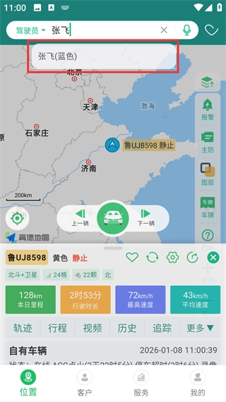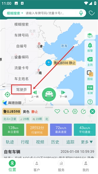 3、切換為【駕駛員】搜索類型后,輸入框會(huì)變?yōu)椤菊?qǐng)輸入駕駛員姓名】,可在此輸入信息。