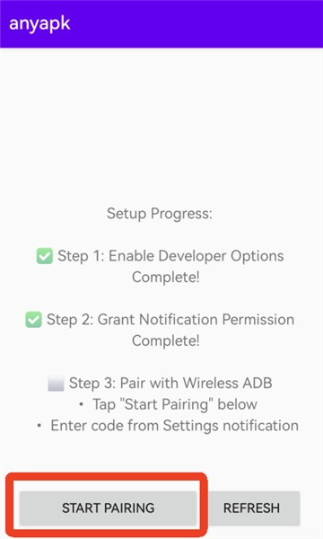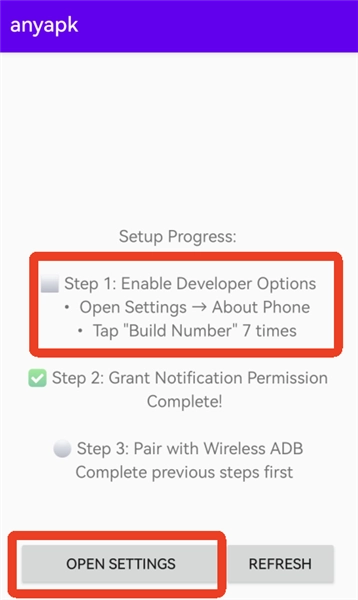 4、之后回到anyapk軟件內可以看到我們的第一步前面有了綠色的√。接下來就是開始第三步,與無線ADB配對。再次點擊左下的【OPEN SETTINGS】。