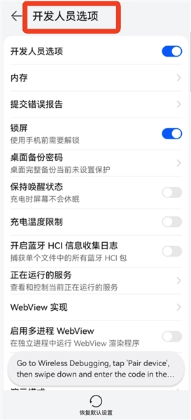 5、會跳轉到【開發人員選項】,找到并勾選“啟用無線調試”選項。根據提示,允許當前連接的WiFi網絡,查看配對碼和端口。