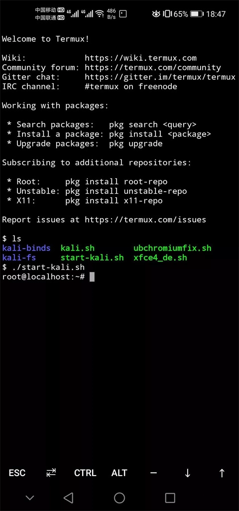 7、目錄下的 start-kali.sh 文件就是我們安裝的 Kali 系統的啟動文件,所以我們輸入命令 ./start-kali.sh 啟動系統: