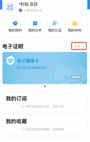1、打開“天府通辦”應用,進入【我的】頁面,接著依次點擊【電子證明】和【全部】選項,最后點擊頁面右上角的【添加證明】按鈕。