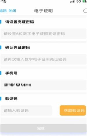 3、回到電子證明頁面,點擊剛才添加的證明,第一次使用時需要設置【亮證密碼】并完成短信驗證;