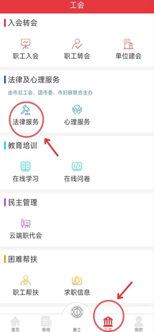 1、從軟件底部導(dǎo)航欄點(diǎn)擊“工會”欄目便可找到“法律及心理服務(wù)”,點(diǎn)擊“法律服務(wù)”進(jìn)入即可。