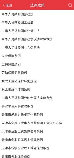 3、法律政策主要包含了《中華人民共和國勞動(dòng)法》、《中華人民共和國合同法》、《中華人民共和國工會法》等政策文件,職工會員可以通過此模塊查詢對應(yīng)的法律條款,以備使用。