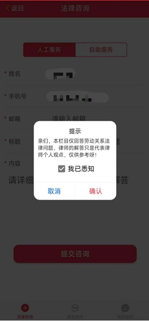 4、法律咨詢的功能主要有2個(gè),一是可以通過人工服務(wù)向律師提交相關(guān)法律問題的咨詢。