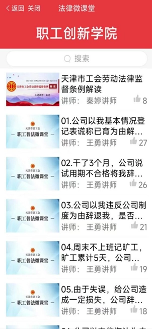 5、法律微課堂模塊為職工會員提供了關(guān)于法律知識的視頻普及,職工會員可以通過此模塊自助學(xué)習(xí)法律知識。