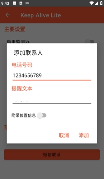 6.添加聯系人的電話號碼、提醒文本,點擊“添加”