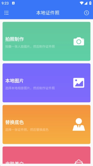 1、打開軟件有拍照制作、本地圖片、替換底色、皮膚美白等功能;