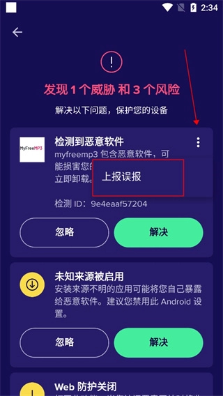 4、如果確認掃描出來的軟件并沒有問題,可以點擊右上角三點,選擇上報誤報;
